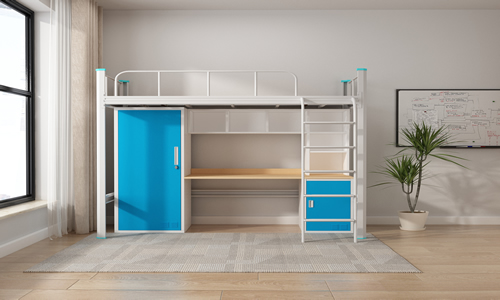 當然,要是大家還是比較喜歡帶抽屜柜的樓梯,也可以像下圖一樣來設(shè)計,一個單獨的雙層鐵床,立于宿舍的一角,配置著蚊帳架、桌、衣柜等,再床的一旁安置一個獨立的踏板樓梯柜,想上去,就上去,想下來,就下來,這樣的設(shè)計,我想,無論是小學生,還是大學生,都能輕松的駕馭這個上下鋪。