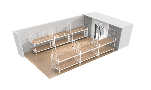 上圖四中所示與上圖中所示一樣,是一個(gè)公寓式的雙層鐵床,只不過它的樓梯變成了一個(gè)爬梯,雖然沒有像上圖中得到更多的空間,卻能鍛煉學(xué)生們上下床的能力,也可以在下鋪里看看書,聊聊天。